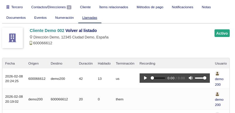 8. Al colgar, la llamada se registra en la pestaña "Llamadas" del tercero, del usuario y en Utilidades / CDR.