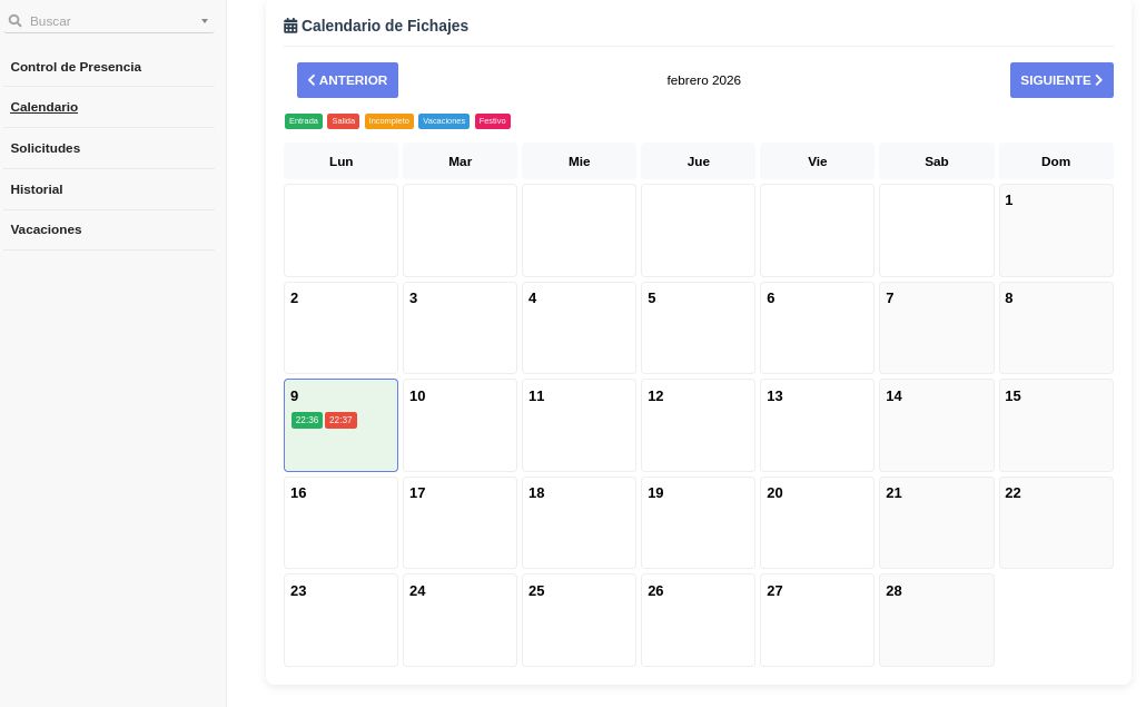 - El calendario de fichajes muestra entradas, salidas, incompletos, vacaciones y festivos codificados por color
