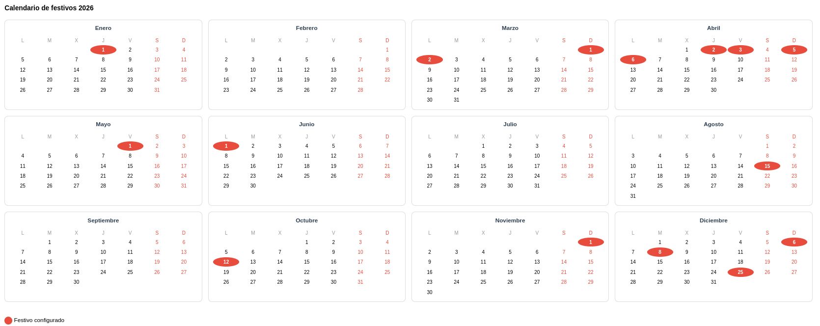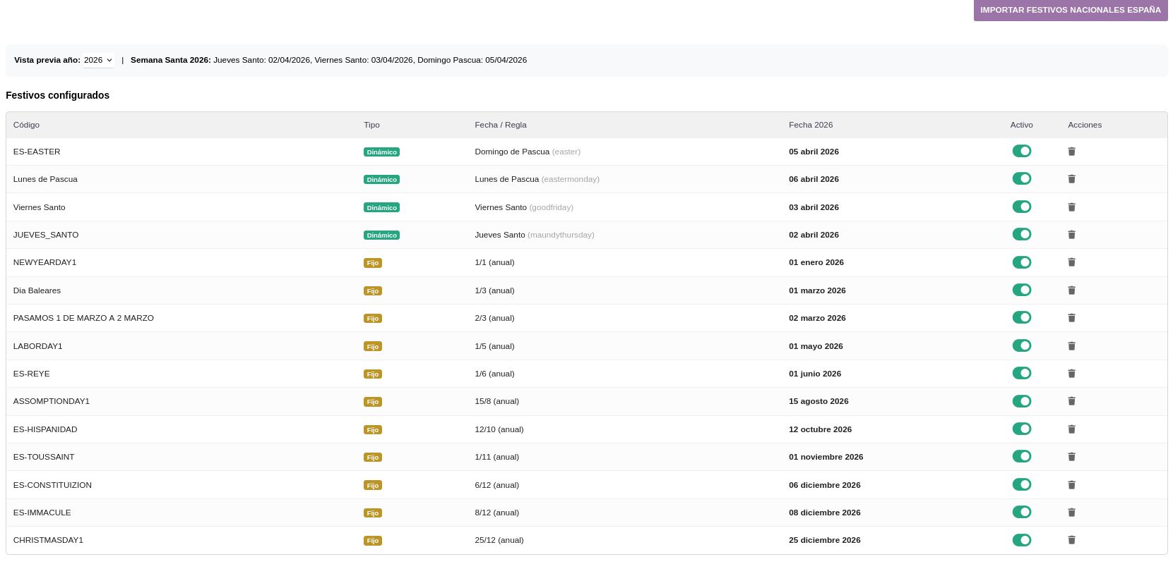 - Los festivos se configuran como fijos o din谩micos (Semana Santa), con importaci贸n autom谩tica de festivos nacionales de Espa帽a