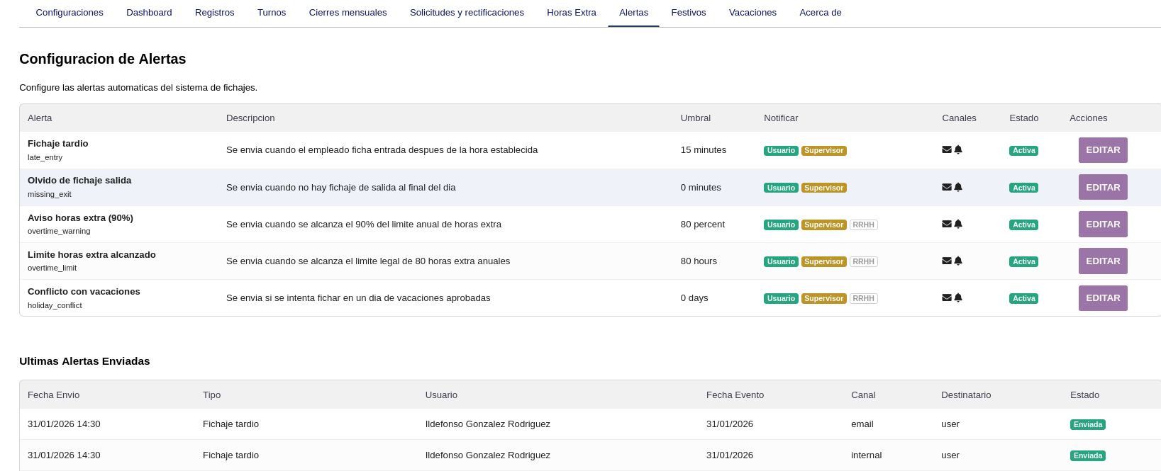 - Las alertas autom谩ticas notifican por email e internamente sobre fichaje tard铆o, olvido de salida, aviso/l铆mite de horas extra y conflicto con vacaciones
