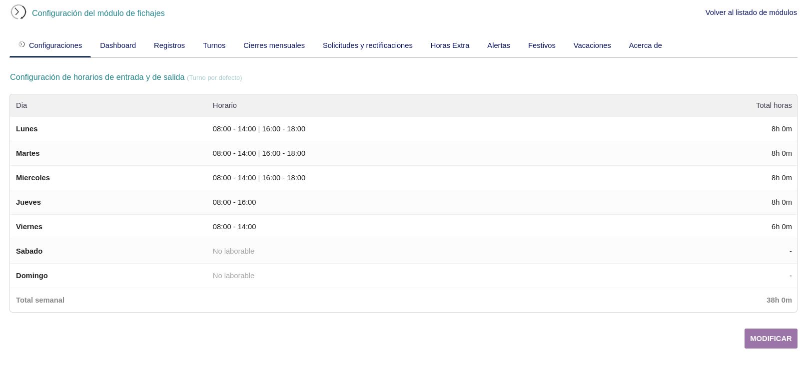 - Configura los horarios de entrada y salida por d铆a de la semana (jornada partida o continua) con total semanal