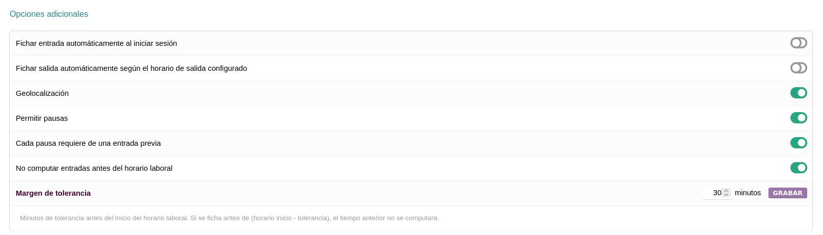- Activa opciones adicionales: fichaje autom谩tico al iniciar sesi贸n, cierre autom谩tico, geolocalizaci贸n, pausas y margen de tolerancia