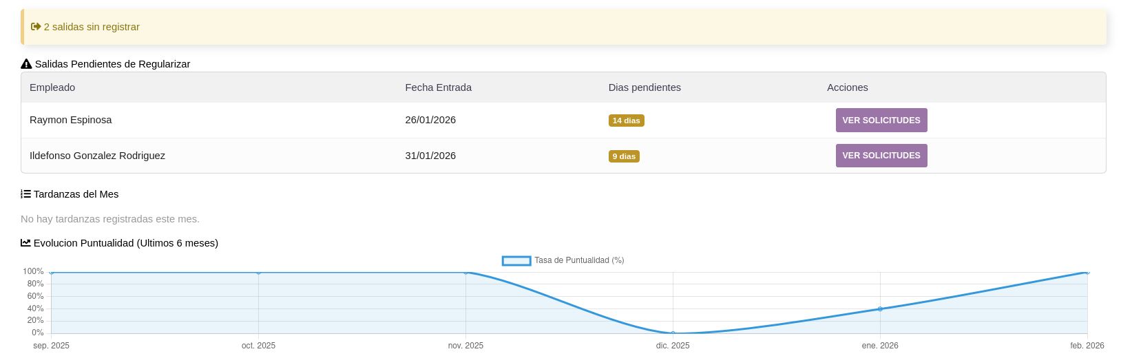 - El dashboard muestra salidas pendientes de regularizar, tardanzas del mes y evoluci贸n de puntualidad de los 煤ltimos 6 meses