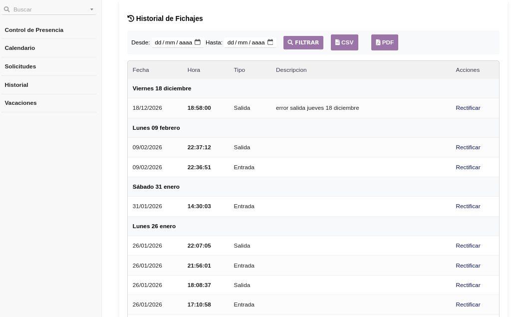 - El historial permite filtrar por fechas, rectificar registros y exportar a CSV o PDF