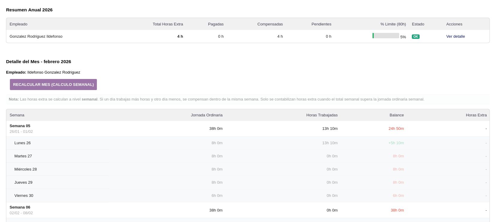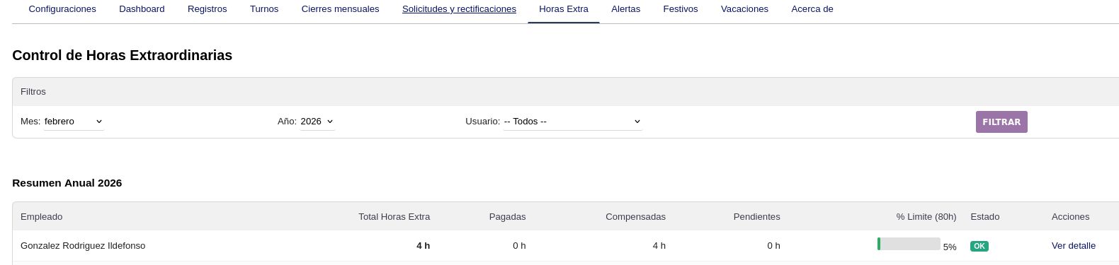 - El control de horas extra calcula semanalmente comparando jornada ordinaria vs. horas trabajadas, con resumen anual y % del l铆mite legal (80h)
