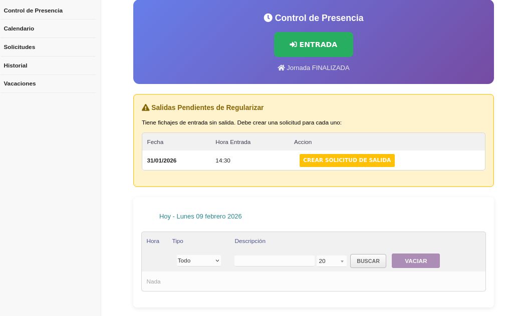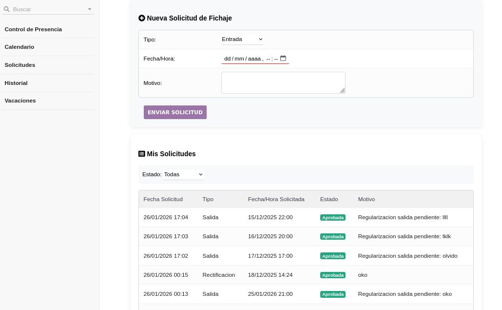 - Consulta su calendario, historial y solicita rectificaciones o fichajes nuevos con motivo.
