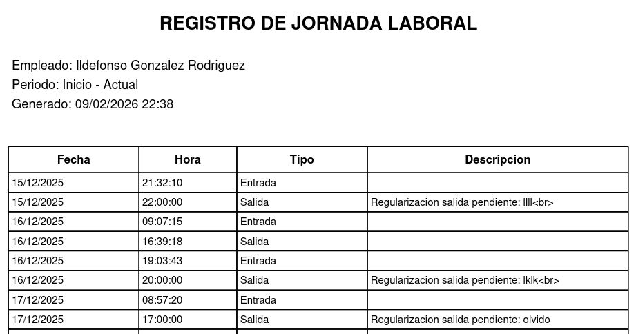 - Cumplimiento normativo del registro horario con generaci贸n de PDF del registro de jornada laboral