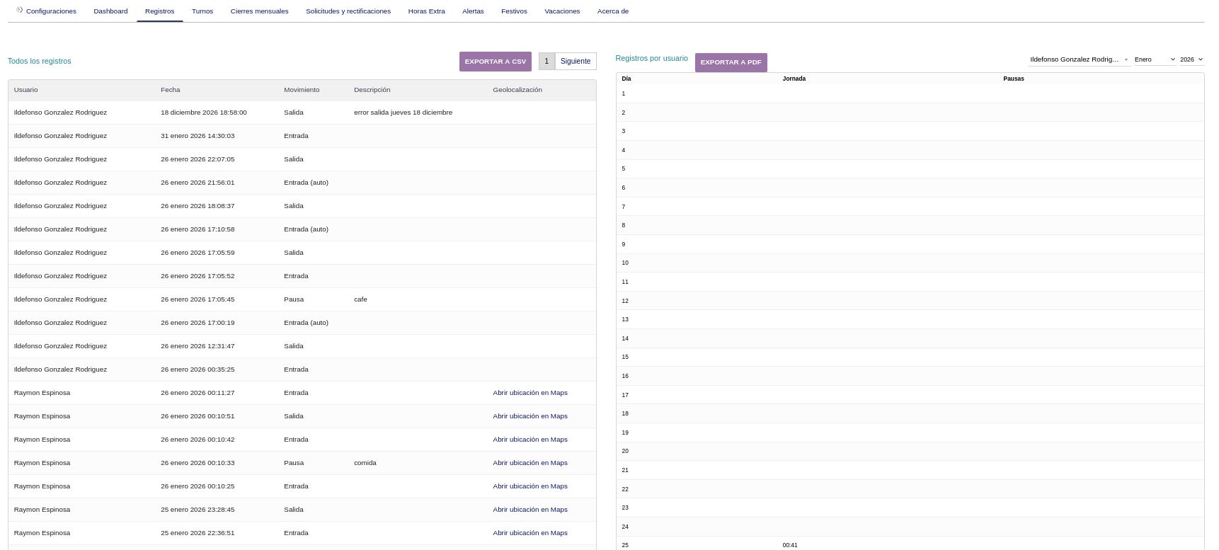 - Exportaci贸n de registros a CSV y PDF del registro de jornada laboral