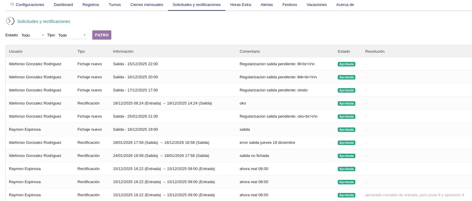 - Las solicitudes de fichaje nuevo o rectificaci贸n incluyen tipo, fecha/hora y motivo, con flujo de aprobaci贸n del supervisor