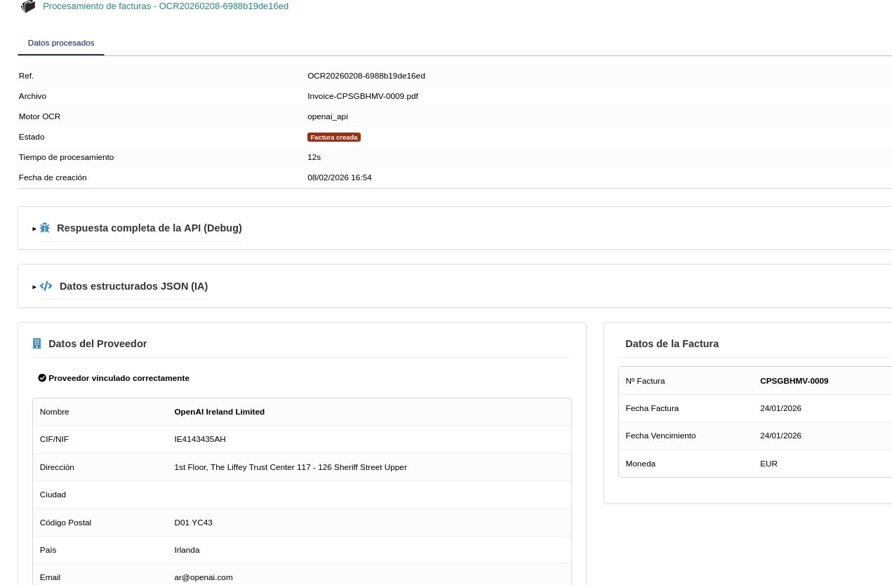- Revisa los datos extraídos: proveedor detectado (nombre, CIF, dirección, país) y datos de factura (número, fecha, vencimiento, moneda)