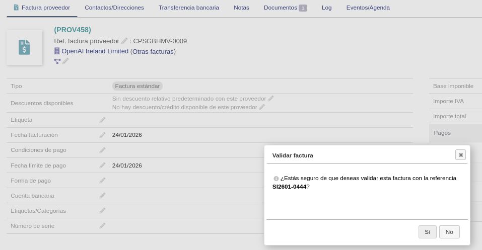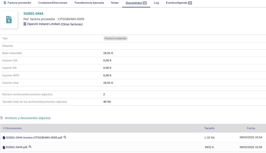 - Validar la factura — el PDF original se adjunta automáticamente a Documentos.