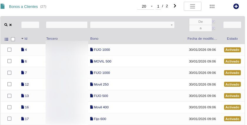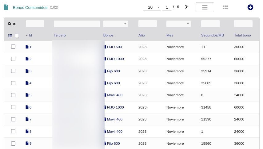 • Asigna bonos a clientes con fecha de activación y estado, y consulta los bonos consumidos por tercero, mes y año con detalle de segundos/MB usados vs. total