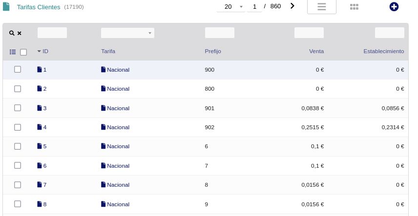 • Tarifas generales por tipo de destino y tarifas personalizadas por cliente con precios por prefijo.